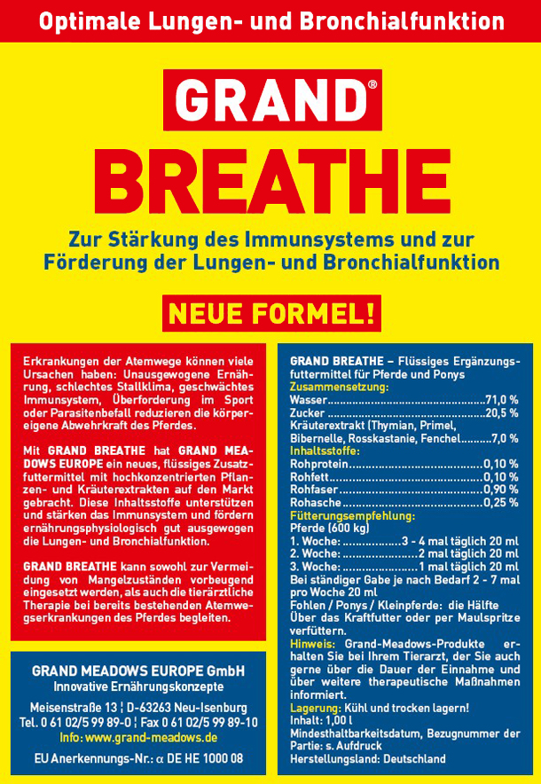Erkrankungen der Atemwege können viele Ursachen haben: Unausgewogene Ernährung, schlechtes Stallklima, geschwächtes Immunsystem, Überforderung im Sport oder Parasitenbefall reduzieren die körpereigene Abwehrkraft des Pferdes. Mit GRAND BREATHE hat Vitality Formula Limited ein neues, flüssiges Zusatzfuttermittel mit hochkonzentrierten Pflanzen- und Kräuterextrakten auf den Markt gebracht. Diese Inhaltsstoffe unterstützen und stärken das Immunsystem und fördern ernährungsphysiologisch gut ausgewogen die Lungen- und Bronchialfunktion.