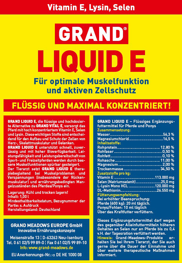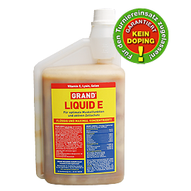 GRAND LIQUID E, die flüssige und hochdosierte Alternative zu GRAND LIQUID E, versorgt das Pferd mit hoch konzentriertem Vitamin E, Selen und Lysin. Diese wichtigen Stoffe sind entscheidend für den Aufbau und Schutz der Zellen von Herz-, Skelettmuskulatur und Gelenken.