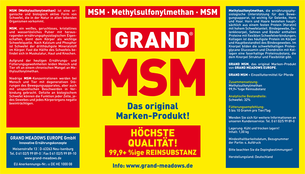 GRAND MSM, das original lizenzierte Produkt von Vitality Formula Limited, ist zur Zeit in Deutschland nur als chemisches Erzeugnis (19%MwSt.) und nicht als Ergänzungsfuttermittel bzw. Nahrungsergänzung erhältlich.