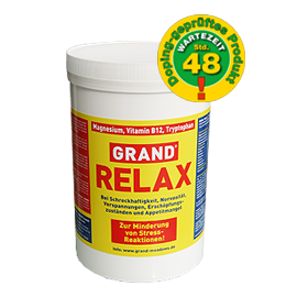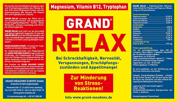Nervosität, Schreckhaftigkeit, Verspannungen und Erschöpfungszustände des Pferdes haben nicht selten Magnesiummangel und eine Unterversorgung des Körpers mit Vitamin B12 und Tryptophan zur Ursache. GRAND RELAX versorgt das Pferd mit einer hochkonzentrierten und ausgewogenen ernährungs-physiologischen Formel dieser Wirkstoffe schnell, zuverlässig und mit hoher Bioverfügbarkeit.