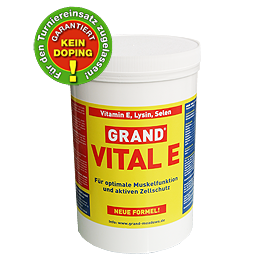 GRAND VITAL E versorgt das Pferd mit hoch konzen-triertem Vitamin E, Selen und Lysin, wichtig für den Schutz der Zellmembran von Muskeln und Gelenken. GRAND VITAL E unterstützt schnell, zuverlässig und mit hoher Bioverfügbarkeit. Leistungsfähigkeit und -bereitschaft von Sport- und Freizeitpferden werden durch bessere Muskelfunktionen spürbar gesteigert.